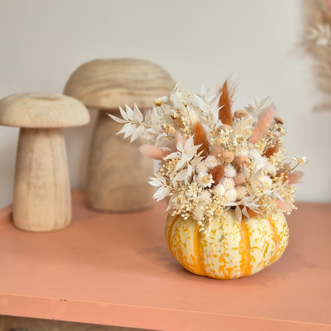 Plongez dans une ambiance automnale et créative en réalisant votre propre citrouille fleurie, décorée de fleurs séchées aux couleurs douces et chaleureuses.