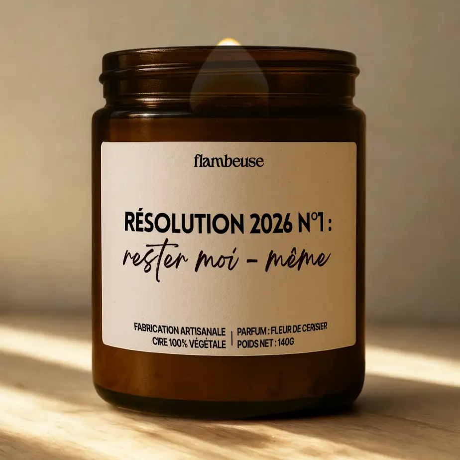Craquez pour la bougie “Résolution 2026 n°1 : Rester moi-même” signée Flambeuse : cire végétale, parfum de Grasse et fabrication artisanale française.