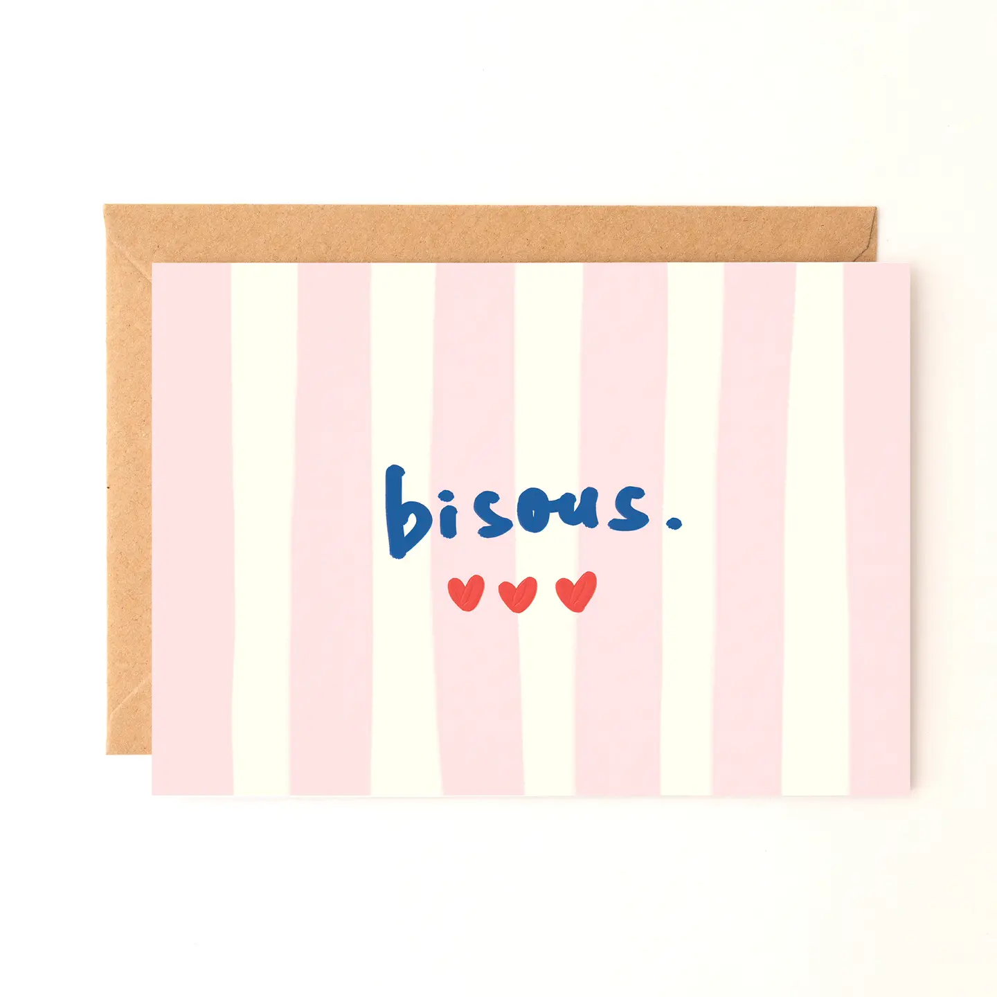 Dessinée à la main à Paris, elle présente un fond rayé, un lettrage ludique « Bisous » et trois petits cœurs mignons, alliant minimalisme et chaleur.