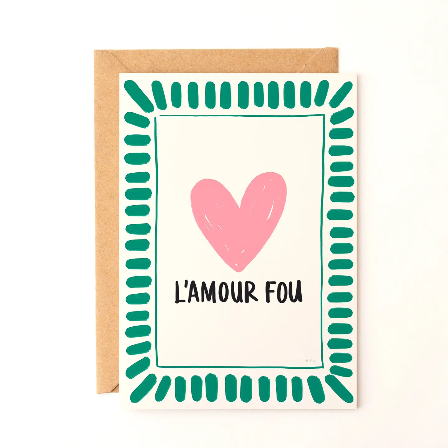 Une carte audacieuse et romantique avec un grand cœur rouge encadré de vert, portant les mots L’Amour Fou en lettres manuscrites. Inspirée par des expressions françaises et le design de posters vintage, cette carte est idéale pour la Saint-Valentin, les anniversaires ou les expressions quotidiennes d’amour.