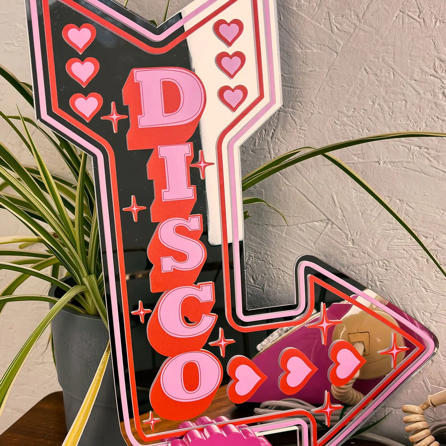 Ajoutez une touche de nostalgie et d’originalité à votre maison avec notre Miroir Disco Rétro. Doté d’un design inspiré des enseignes au néon avec une forme de flèche ludique en rose et rouge, c’est un ajout amusant à n’importe quelle pièce.